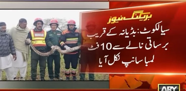 SIALKOT: A panic situation erupted in a neighbourhood of Sialkot, Budyana as a long snake in a rain stream surfaced suddenly , ARY News reported.