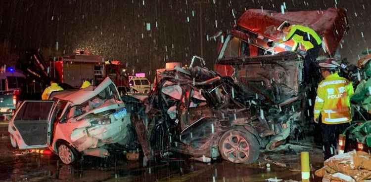 State broadcaster CCTV aired video from the scene showing heavy snow and many crippled and twisted vehicles.