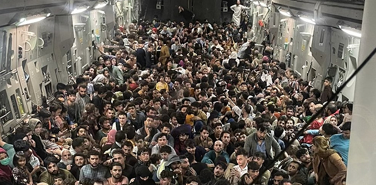 A photo shows more than 600 Afghans — women, men, children and the elderly — sitting packed on the floor of a cavernous US military plane, part of a dramatic airlift hours after Kabul fell to the Taliban.