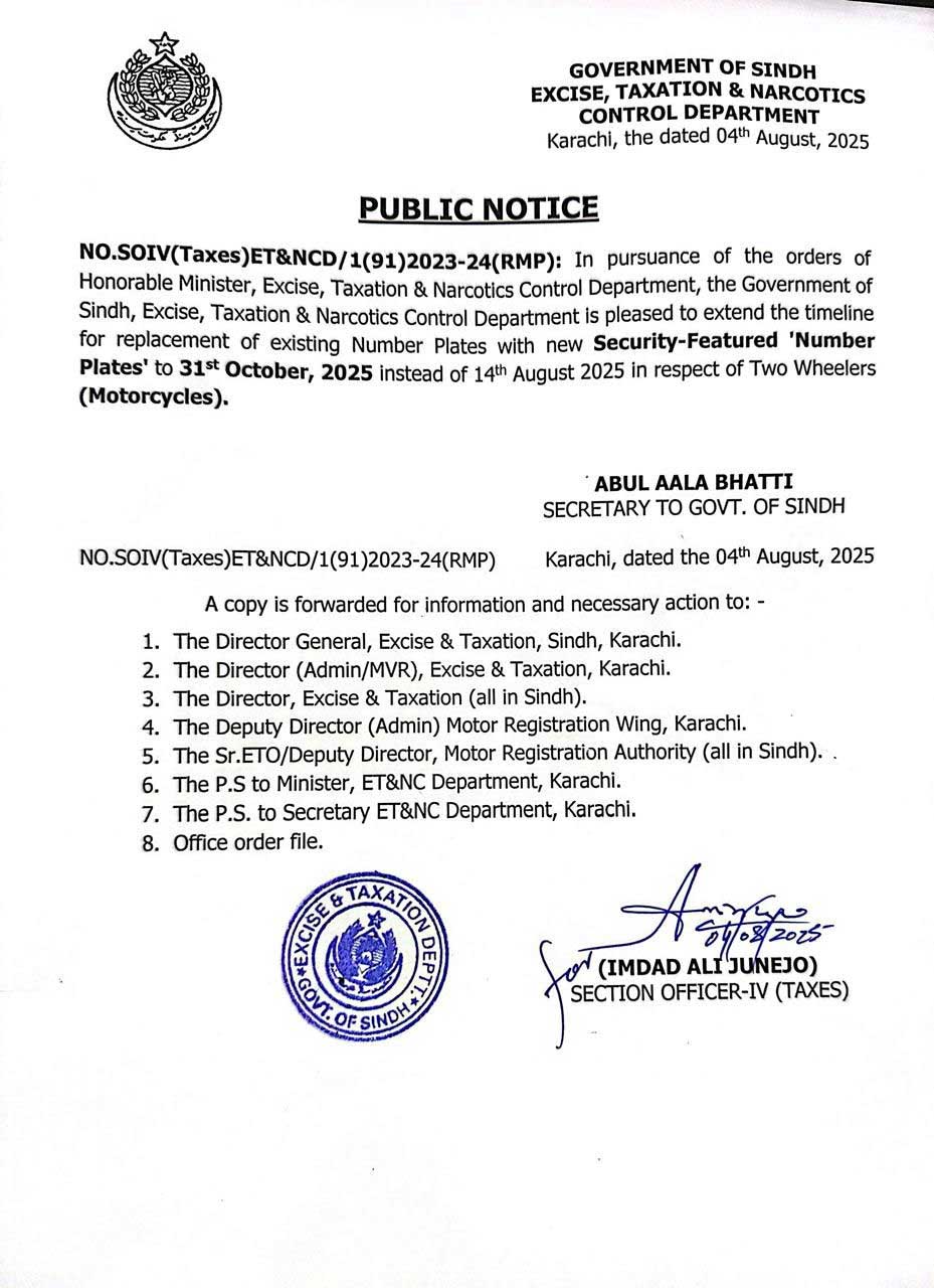 According to a notification issued by the Excise and Taxation Department of Sindh, the previous deadline of August 14 has been extended to October 31 to facilitate vehicle owners.