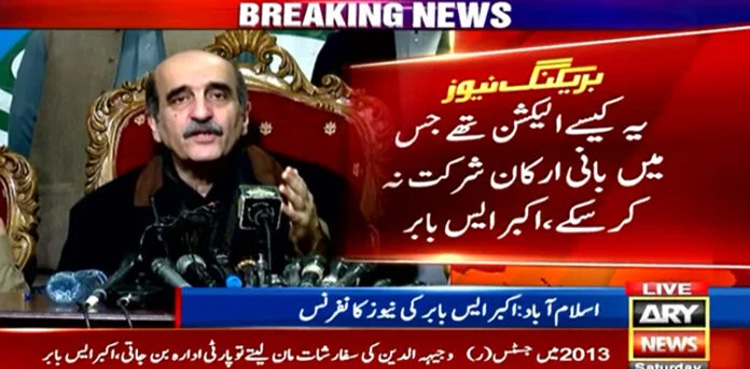 Addressing a press conference, Akbar S Babar declared the PTI’s intra-party election fraud saying that he had reservations about the intra-party election being more likely to be a selection as candidates were not allowed to file nomination papers for the PTI chairmanship.