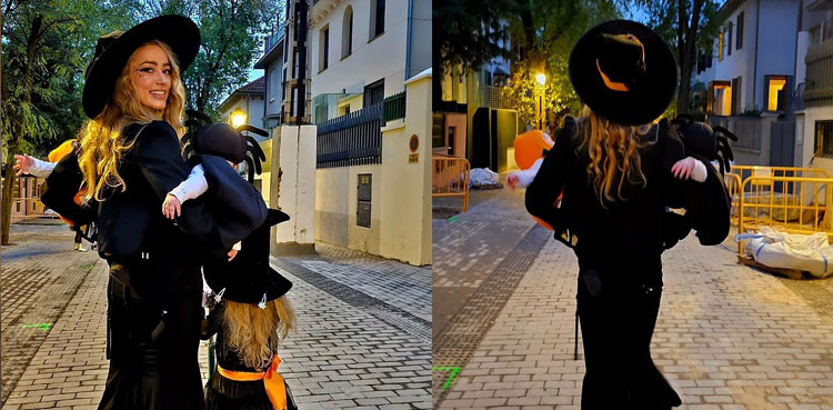 In the photos, Amber Heard was seen dressed as a witch in a black dress with a pointed hat, holding her 5-month-old twins, who were also dressed in festive Halloween outfits with one wearing a spider hat and the other sporting an orange pumpkin hat.