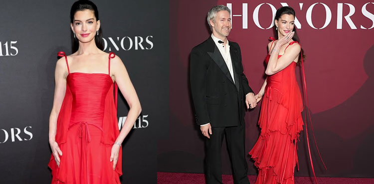 Anne Hathaway shares sweet PDA with husband at WWD Honors red carpet