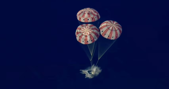 The splashdown under partly cloudy skies was carried by live video feed in a NASA webcast. “A perfect bull’s eye splashdown for Integrity and its four astronauts,” NASA commentator Rob Navias said moments after the landing.