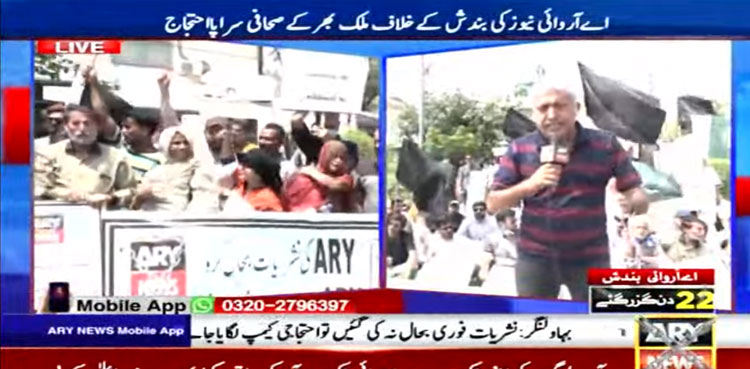 During the protest, the demonstrators condemned the suspension of ARY News transmission and demanded the restoration of the channel.
