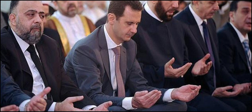 Assad’s office published images of him praying inside the brightly-lit Al-Nuri mosque at dawn on Sunday before greeting worshippers outside.