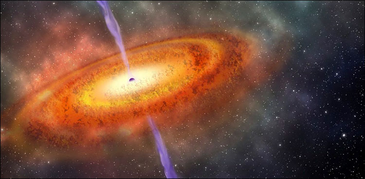 The second – called M87 – resides at the center of the neighboring Virgo A galaxy, boasting a mass 3.5 billion times that of the sun and located 54 million light-years away from Earth. Streaming away from M87 at nearly the speed of light is a humongous jet of subatomic particles.