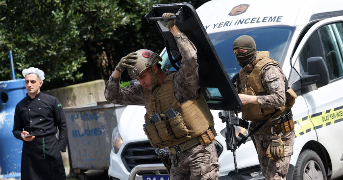 The media reported that two police officers had been injured in the incident, which occurred immediately outside a tower where the Israeli consulate is located in Istanbul’s financial district.