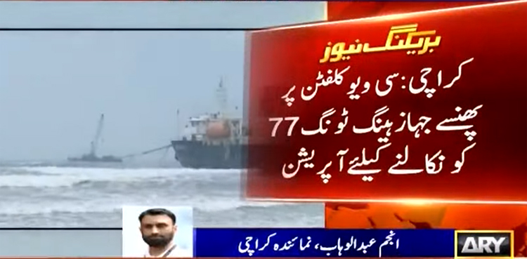 KARACHI: Another attempt to extricate the stuck ill-fated cargo ship (MV) Heng Tong 77 is underway on Tuesday’s high tide at the Seaview beach with three strong tugging ropes fastened to pull it back into waters that have so far achieved 100-meter distance, ARY News reported.