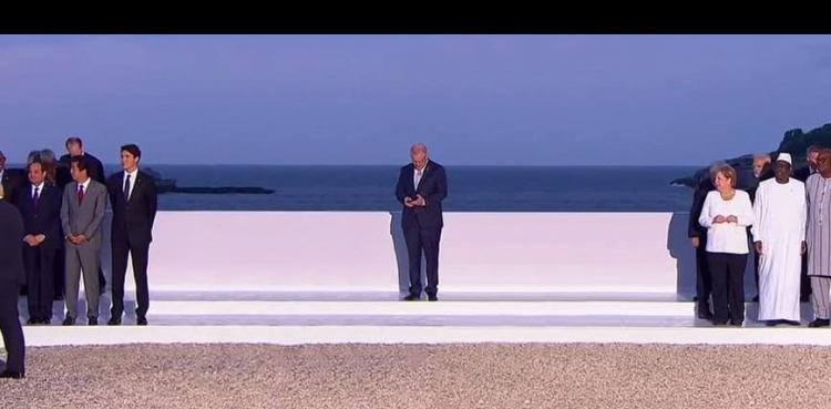 The image appears to have been taken from video, for example here, when Morisson and other world leaders stood together for a “family photo” at the G7 summit on August 25.