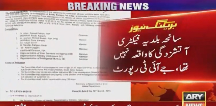 ARY News acquired the investigation report of a Joint Investigation Team (JIT) over Baldia Town factory inferno incident which is being declared as one of Pakistan’s worst industrial disasters. The report was signed by officers of law enforcement institutions who have contributed in the investigation of the factory fire case.