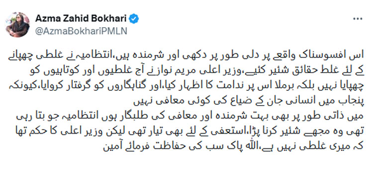 Expressing regret and embarrassment on X (formerly Twitter), Azma Bukhari said she was deeply saddened and ashamed over the tragic incident. She clarified that inaccurate facts were initially provided by the administration in an attempt to conceal mistakes, which were then shared publicly.
