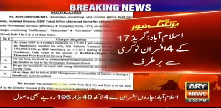 ISLAMABAD: Services of four government officers terminated over illegally taking tri-monthly handouts of the Benazir Income Support Programme (BISP), ARY News reported on Saturday.