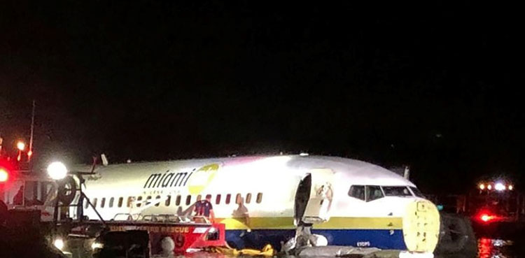 A Boeing 737 slid off a runway into a river after crash-landing at a Florida naval air station Friday, officials said, with no fatalities reported.