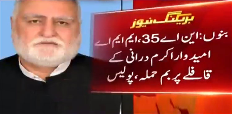 BANNU: A bomb ripped through the convoy of Muttahida Majlis-i-Amal (MMA) candidate Akram Khan Durrani in a Bannu neighborhood this morning. He, however, escaped unhurt while four people were killed and 14 others injured in attack, ARY News reported.