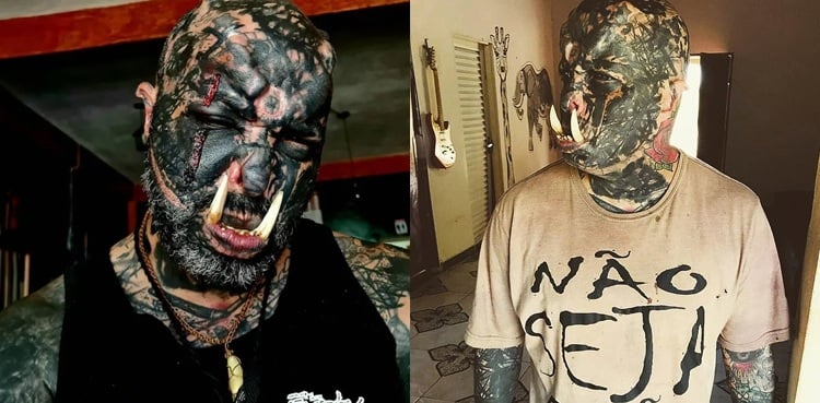 A 41-year-old Brazilian man has transformed himself into a real-life ‘Orc’ from Lord of the Rings with tattoos covering 85 per cent of his body, piercing, a tongue split and eyeballs tattoed.