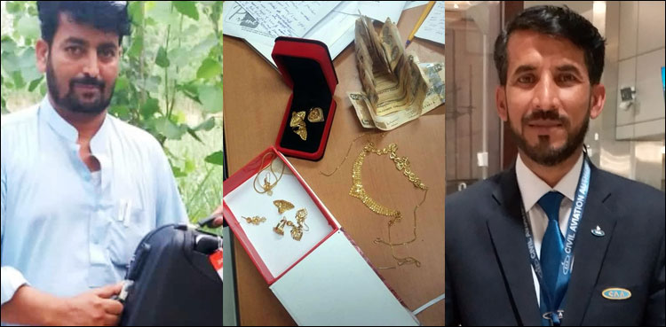 CAA Vigilance Assistants Shahzad and Haneef found a bag at international arrival of the Peshawar airport containing seven tola gold, 3,600 UAE dirham, one iPhone mobile and other valuable items for the dowery of her daughter .
