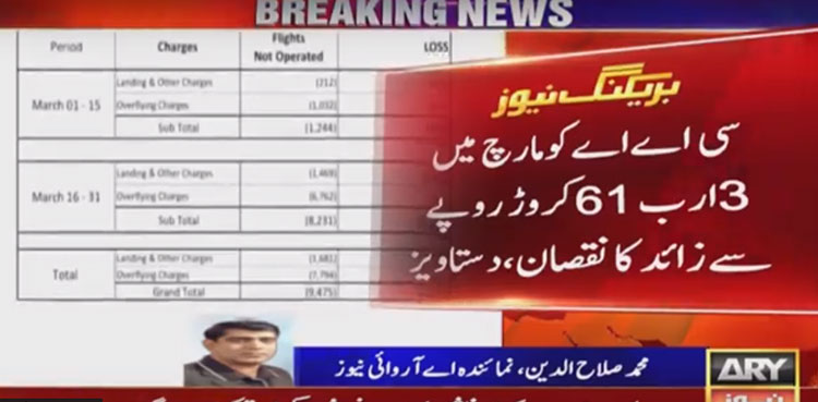 ISLAMABAD: The Civil Aviation Authority (CAA) has suffered a loss of Rs3.6 billion in the month of March owing to suspension of flights to different counters amid coronavirus outbreak, ARY News reported on Thursday.