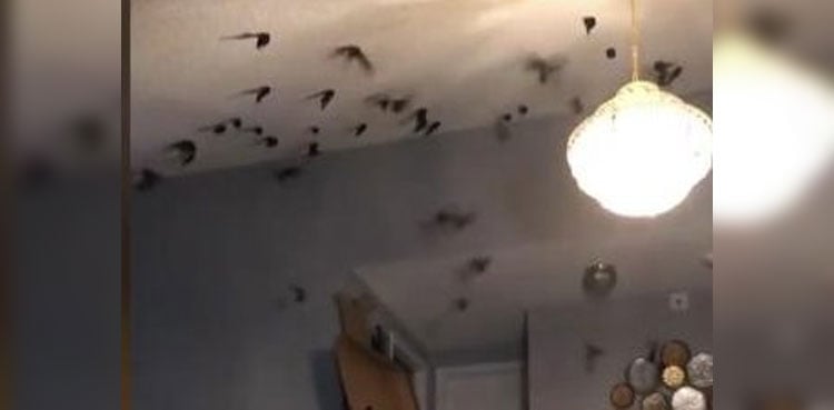 Kerri captured video showing dozens of birds swooping down into the home through her chimney.