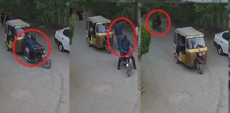 The CCTV footage shows two street criminals on a motorcycle intercepting a rickshaw, which was carrying a family, and robbing them of their belongings, before fleeing the scene.