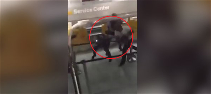 The man continues to lash out, kicking and punching the officers in front of Lufthansa check-in desks.