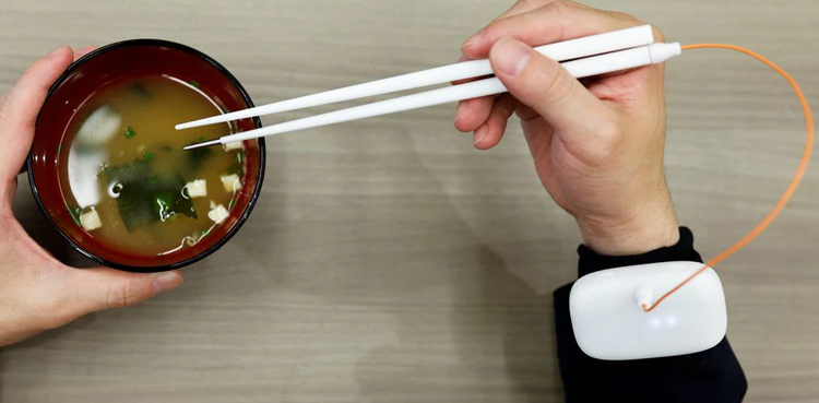 The device uses a weak electrical current to transmit sodium ions from food, through the chopsticks, to the mouth where they create a sense of saltiness, said Miyashita.