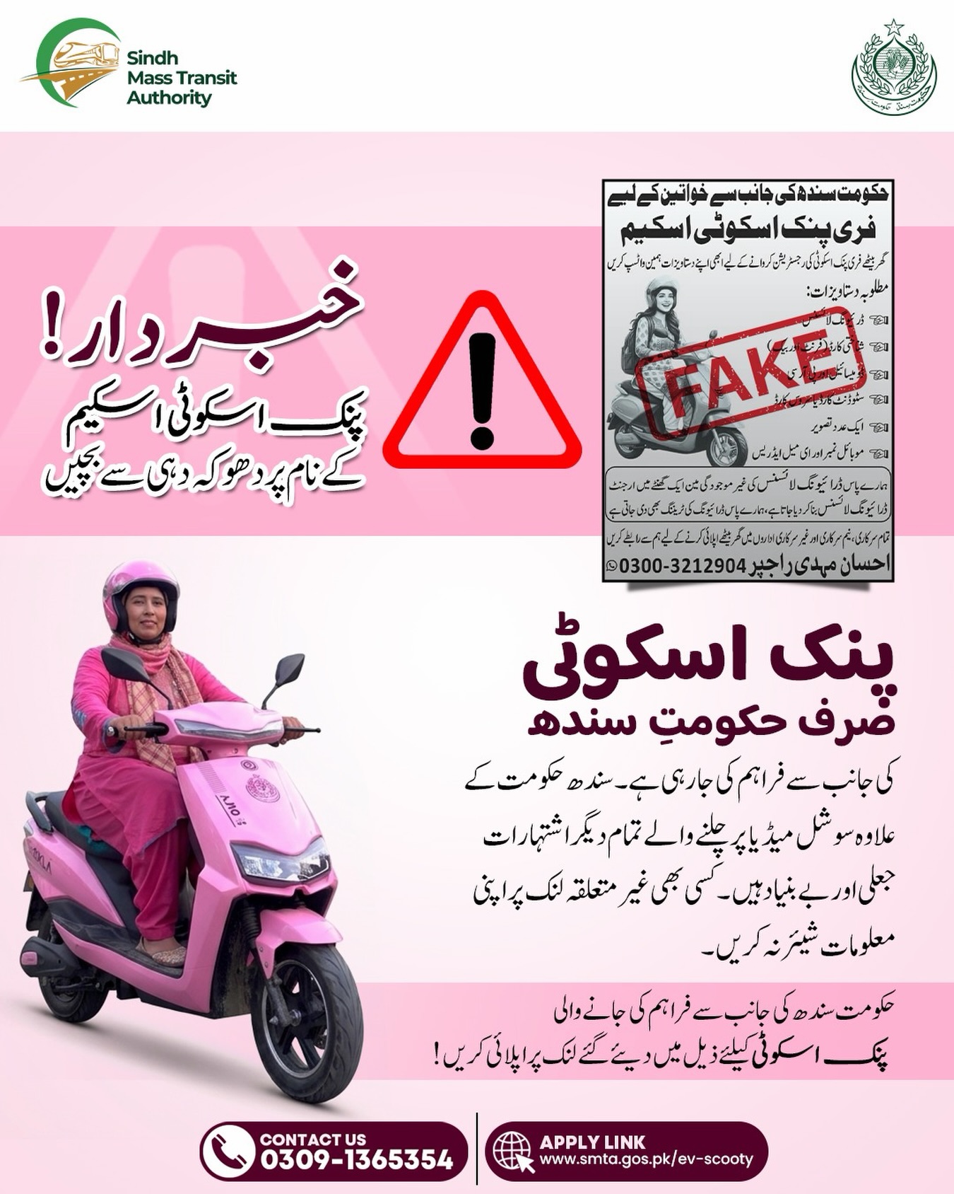 KARACHI: The Sindh Mass Transit Authority (SMTA) has issued an urgent warning to citizens, advising them to protect themselves against fraudulent schemes operating under the name of the Pink Scooty Scheme.