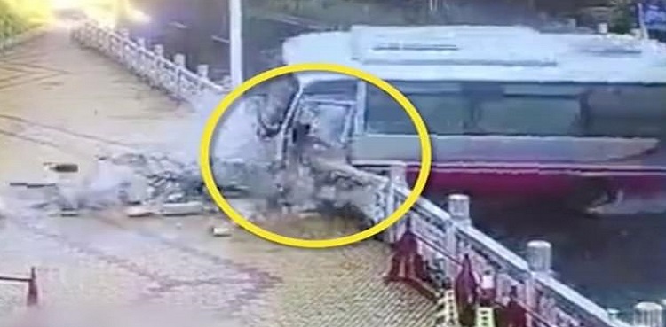 A coach driver in China has miraculously survived after he was thrown out of his vehicle window during a horrendous accident.