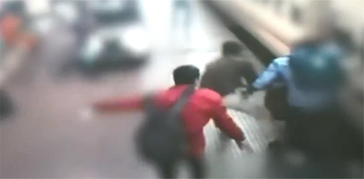 According to the details, the female passenger was trying to board a moving train along with other people when she lost her balance and was about to go down in the space between the train and the platform.