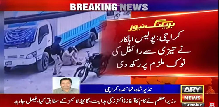 KARACHI: Police on Tuesday arrested an alleged mugger as the entire episode of his capture was caught on camera showing how two cops endangered their lives in a daring bid, ARY NEWS reported.