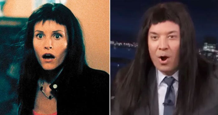 Courteney Cox reacts to Jimmy Fallon wearing her Scream 3 baby bangs