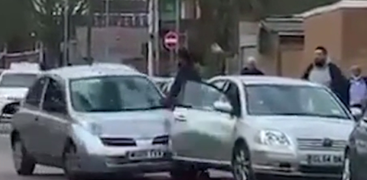 A video showed an enraged driver hitting another car carrying an infant after an altercation with the motorist in another silver vehicle in a residential area in Ilford located in east London.