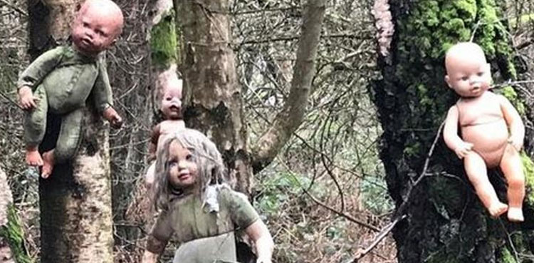 In a horrific incident, several creepy baby dolls found nailed to trees in a forest under mysterious circumstances in England’s Staffordshire.