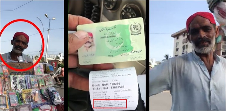 In the video that went viral on social media, traffic police officials can be seen issuing the challan to cyclist Muhammad Iqbal for wrong-way driving in Clifton area of Karachi.
