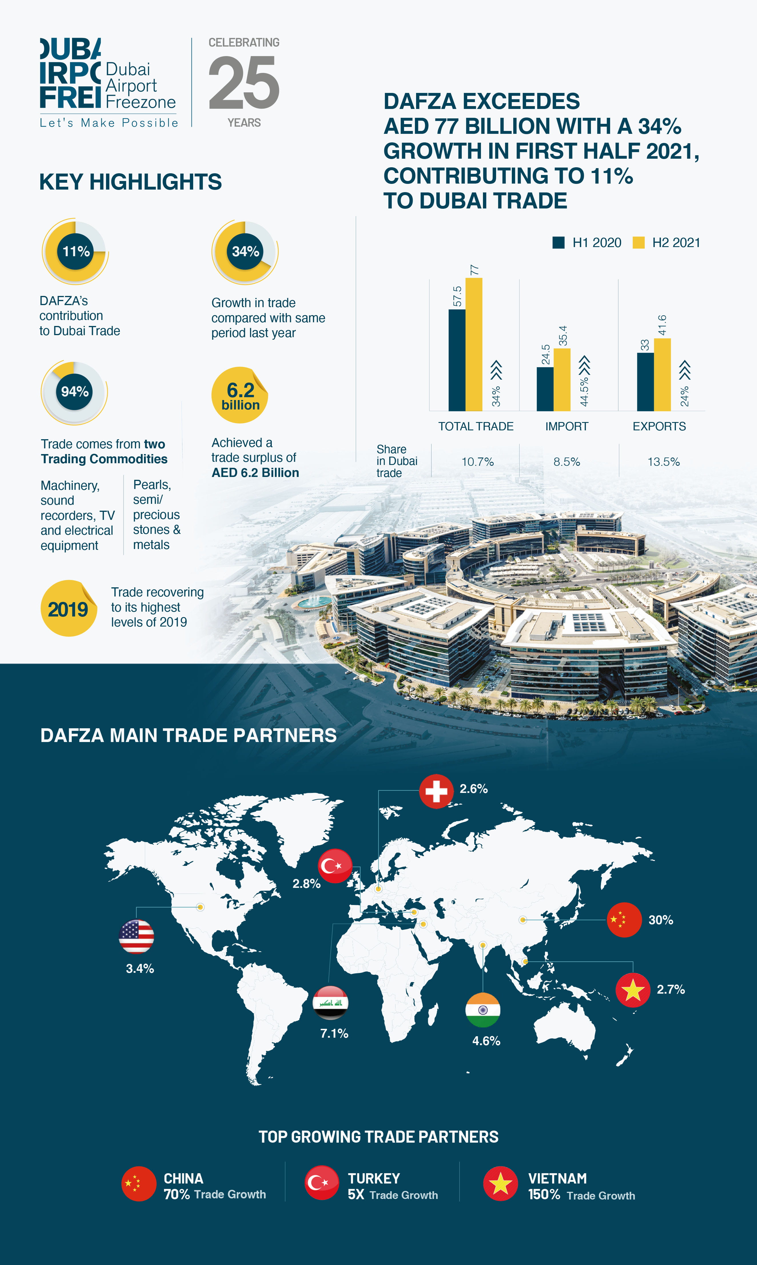 The Dubai Airport Freezone Authority (DAFZA) announced that its contribution to Dubai’s non-oil foreign trade for the first half of 2021 reached 11%. H1 trade in the Freezone grew 34% from the same period last year to reach AED77 billion, with a trade surplus of AED6.2 billion.