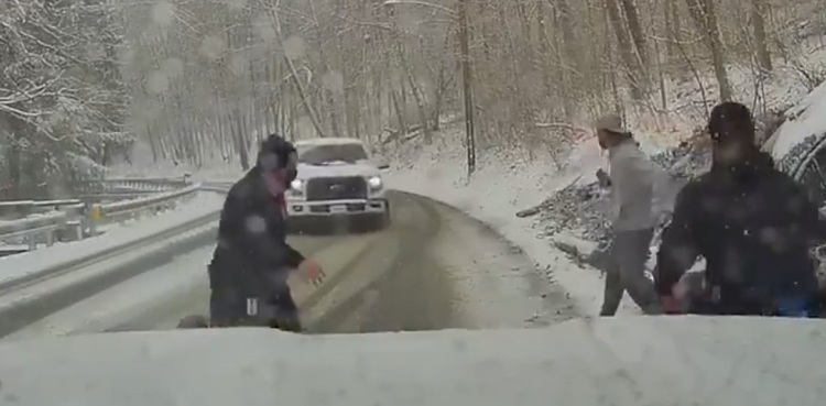 A dashcam video showed a speeding truck slammed into the emergency medical services (EMS) vehicle in snowy conditions when the workers were busy checking the occupants of a car for injuries.