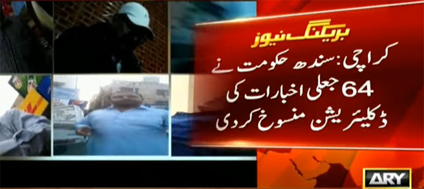 KARACHI: Sindh government on Tuesday cancelled declarations of at least 64 dummy publications publishing in the province, ARY News reported.