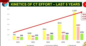 Providing details of counter-terrorism efforts, the DG ISPR said that law enforcement agencies (LEAs) carried out 75,175 intelligence-based operations (IBOs) during 2025, resulting in the killing of 2,597 terrorists. He added that 1,235 security personnel were martyred in terrorist attacks across the country.