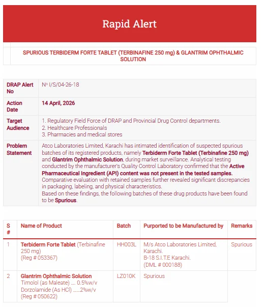 According to DRAP, specific batch numbers of these drugs were found to be severely hazardous for human health and manufactured outside registered pharmaceutical facilities.