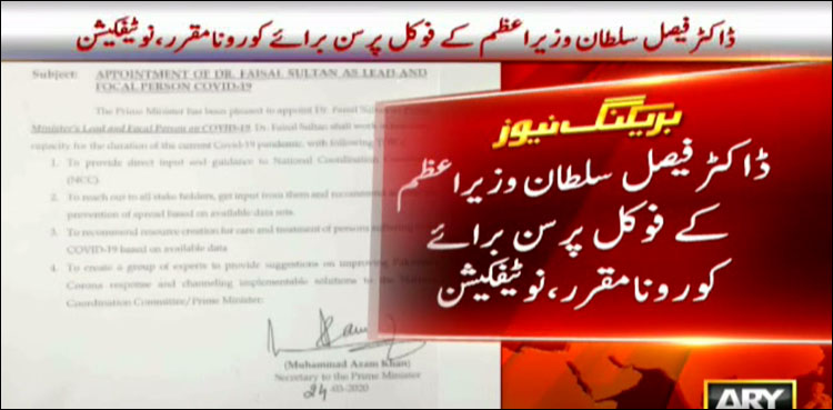 ISLAMABAD: Prime Minister Imran Khan has appointed Dr Faisal Sultan as his focal person on coronavirus (COVID-19) as the country’s virus tally climbed up over 1000 case with eight deaths on Wednesday, ARY NEWS reported.