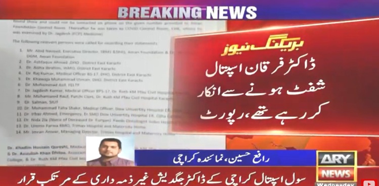 The staff at the hospital’s emergency ward shifted Dr Furqan-ul-Haq to the corona ward where Dr Jagdesh examined and referred him to another hospital despite the patient being in critical condition, according to the report.
