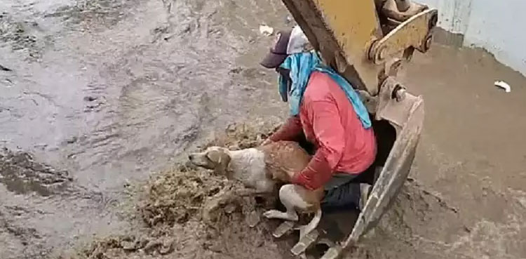 The viral video sees the labourer Abel Murillo seated on the excavator over the strong flow of water. He has his arms stretched out as the dog came closer to him.