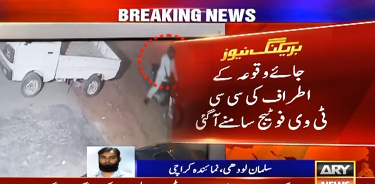 The CCTV footage – available with ARY News – showed the alleged attacker, wearing a white shirt, entering the flats on a motorcycle.