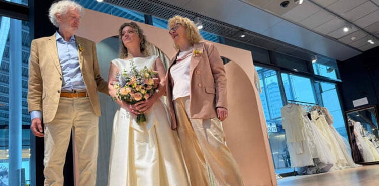 To underline the wedding’s sustainability theme, a pop-up store at the rail station offered dozens of wedding dresses, free to anyone willing to sign up to the concept.