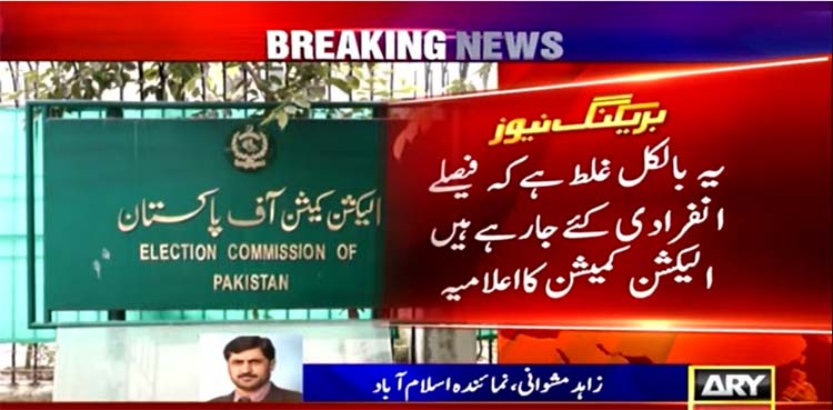 ISLAMABAD: The Election Commission of Pakistan (ECP) on Thursday rejected an impression being created that decisions in the commission are being taken by an individual and said that since January 2020, the decisions are taken unanimously, ARY NEWS reported.