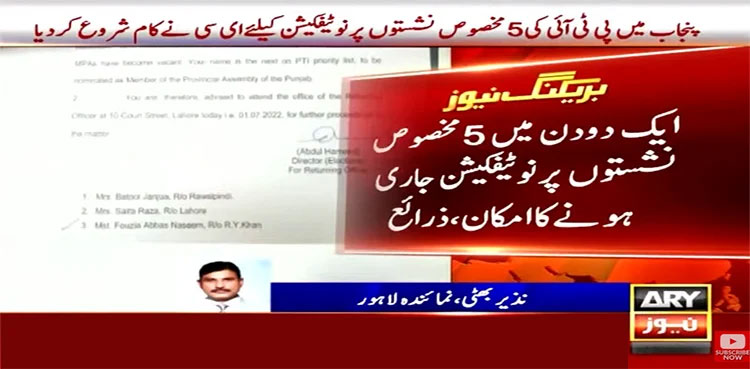 ISLAMABAD: The Election Commission of Pakistan (ECP) has started working on the notification for five reserved seats in the Punjab Assembly for women and minorities that fell vacant following the de-seating of 25 PTI lawmakers over defection, ARY News reported.