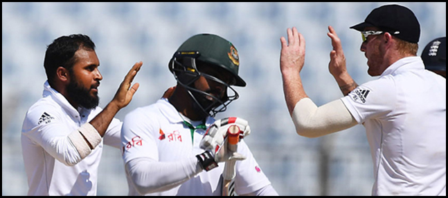 Bangladesh’s left-arm spinner Taijul Islam trapped Gareth Batty leg before off his second ball after Stuart Broad was run out on his overnight score of 10.