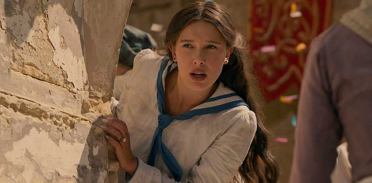 The pictures released showed Enola (Millie Bobby Brown) in a sun-soaked new locale, juggling her potential nuptials to Lord Tewkesbury (Louis Partridge) and a challenging new case, which, as seen in an exclusive photo below, might involve a deadly-looking fire.