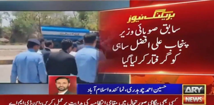 ISLAMABAD: Police on Tuesday arrested former Punjab minister Ali Afzal Sahi from outside the Judicial Complex in Islamabad, ARY News reported.