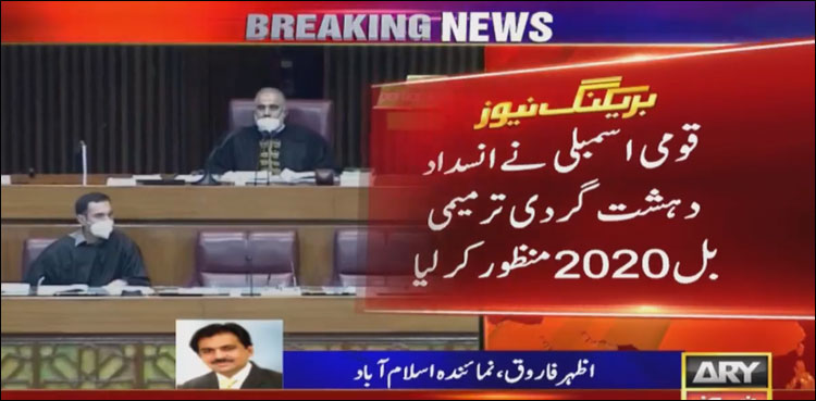 The house approved the Anti-Terrorism (Amendment) Bill 2020, the Limited Liability Partnership (Amendment) Bill 2020, the Companies (Amendment) Bill 2020, the Control of Narcotic Substances (Amendment) Bill 2020, and the Islamabad Capital Territory Trust Bill 2020.